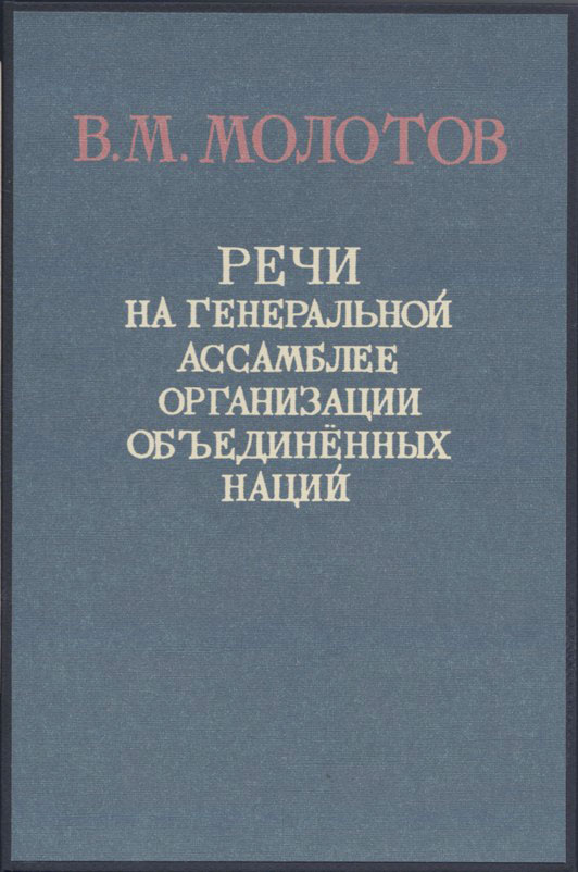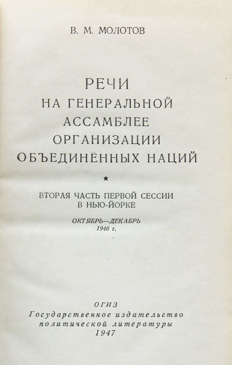 Молотов В.М. Речи на Генеральной ассамблее Организации объединенных наций: Вторая часть Первой сессии в Нью-Йорке. Октябрь-декабрь 1946 г. М.: ОГИЗ - Государственное издательство политической литературы, 1947. 146, [2] с.; 1 л. портр. 19,5 х 12,5 см. В издательском переплете и в современном художественном футляре. Отличная сохранность.