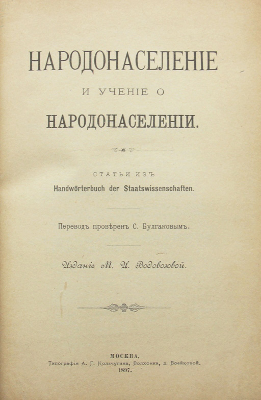 Народонаселение и учение о народонаселении: Статьи из Handwörterbuch der Staatswissenschaften. Перевод проверен С.Булгаковым. М., типография А.Г.Кольчугина, 1897. IV, 336, [2] с. 22,3 х 15,2 см. В современном полукожаном переплете. Отличная сохранность.