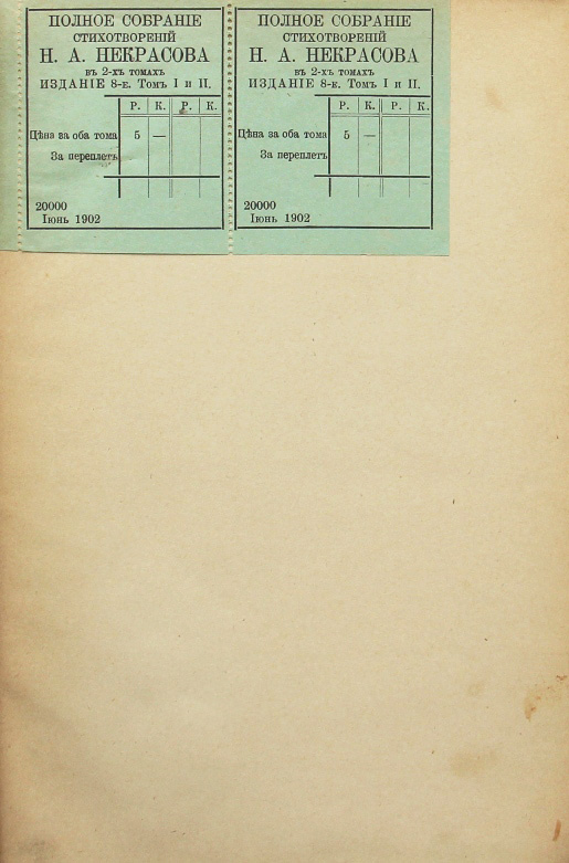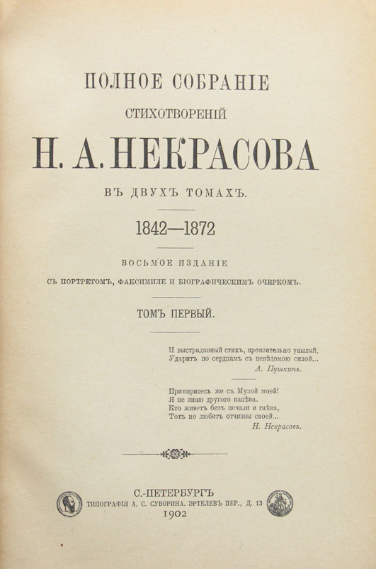 Некрасов Н.А. Полное собрание стихотворений. В двух томах. Восьмое издание. С портретом, факсимиле и биографическим очерком. Спб., типография А.С.Суворина, 1902. 21,3 х 14,3 см. В двух переплетах эпохи с золотым и цветным тиснением на корешках и передних крышках. Очень хорошая сохранность. На пустом листе перед авантитулом Т. I наклеена отрывная марка на подписку на настоящее издание.