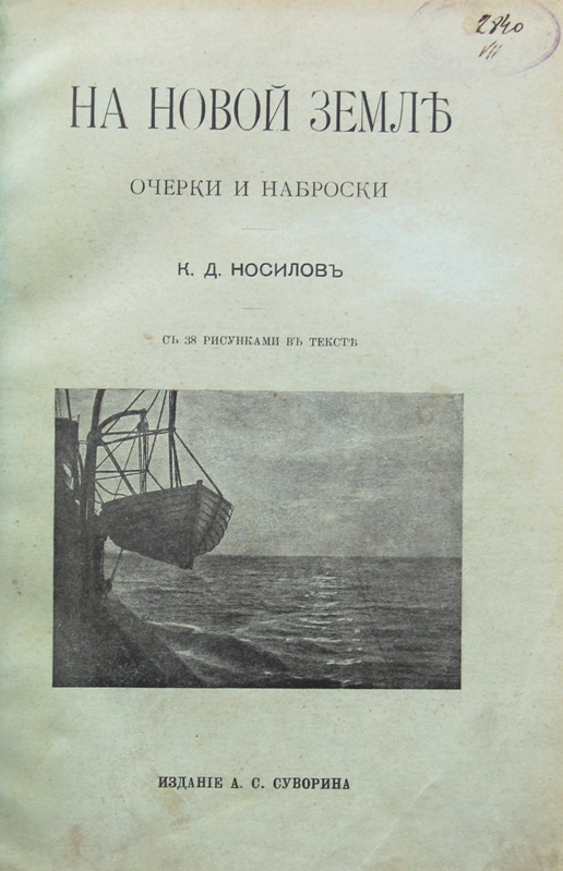 Носилов К.Д. На Новой Земле: Очерки и наброски. С 38 рисунками в тексте. [Спб.], издание А.С.Суворина, 1903. [4], 327, [2] с., с илл. 22,7 х 15,3 см. В современном полукожаном переплете. Сохранена издательская обложка. Очень хорошая сохранность. На передней обложке, авантитуле и с. 1 дореволюционный штамп Офицерской библиотеки Съемки Юго-Западного пограничного пространства.