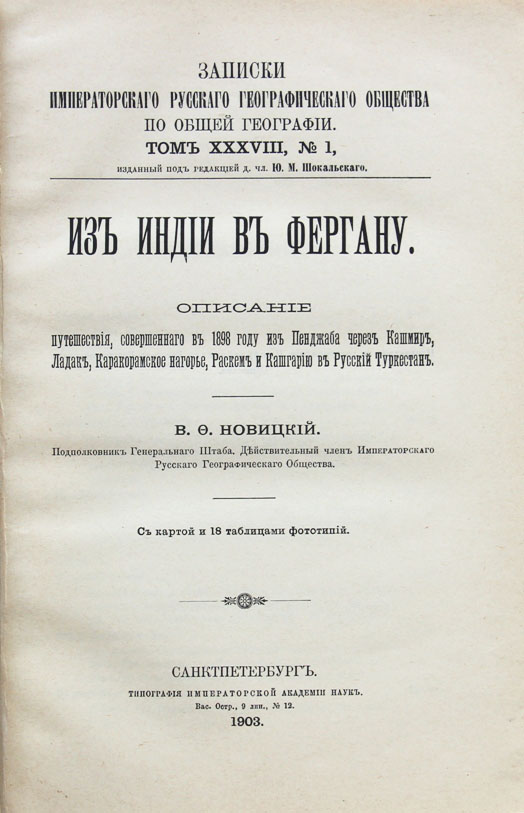 Новицкий В.Ф. Из Индии в Фергану: Описание путешествия, совершеннаго в 1898 году из Пенджаба через Кашмир, Ладак, Каракорамское нагорье, Раскем и Кашгарию в Русский Туркестан. Спб., типография Императорской Академии наук, 1903. [4], III, II, 297 с.; 18 л. илл., 1 л. прил., 1 карта. 23 x 15,3 см. В современном полукожаном переплете с золотым тиснением на корешке. Отличная сохранность.