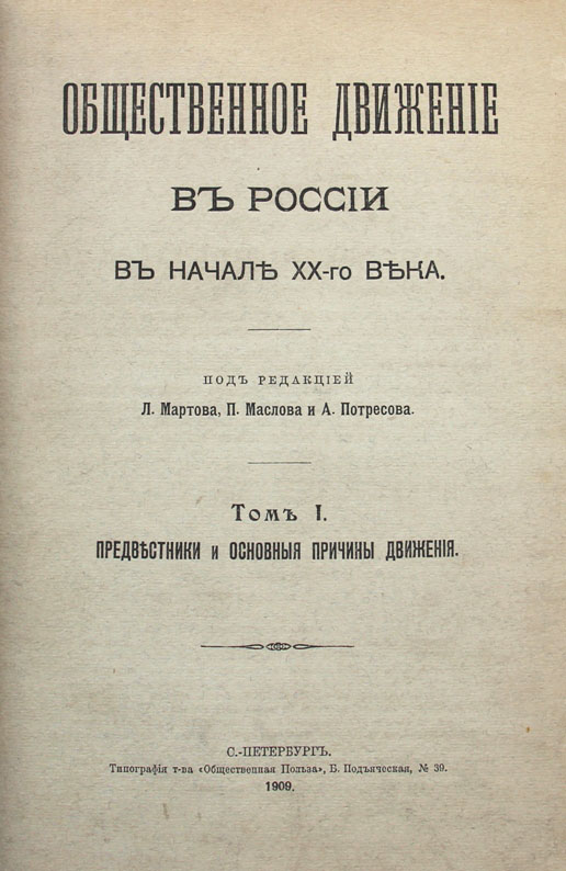 Сборник «Общественное движение» - издание социал-демократов, преимущественно меньшевиков, которые с его помощью полемизировали с большевиками. Его авторами были крупнейшие общественно-политические деятели левого лагеря: П.Б.Аксельрод, Ф.И.Дан, А.М.Колонтай, Л.Мартов, А.С.Мартынов, П.П.Маслов, Г.В.Плеханов, А.Н.Потресов. Из-за начавшейся Первой мировой войны из задуманных пяти томов было издано только четыре. Издание имело научно-исследовательский характер и выходило легально. В нем детально исследуются предпосылки революции 1905-1907 г.г. и ее ход, расстановка социальных сил, их борьба, проявившаяся в деятельности партий, и ее результаты. Авторы постарались по возможности объективно подойти к освещению темы, руководствуясь научными принципами исследования.