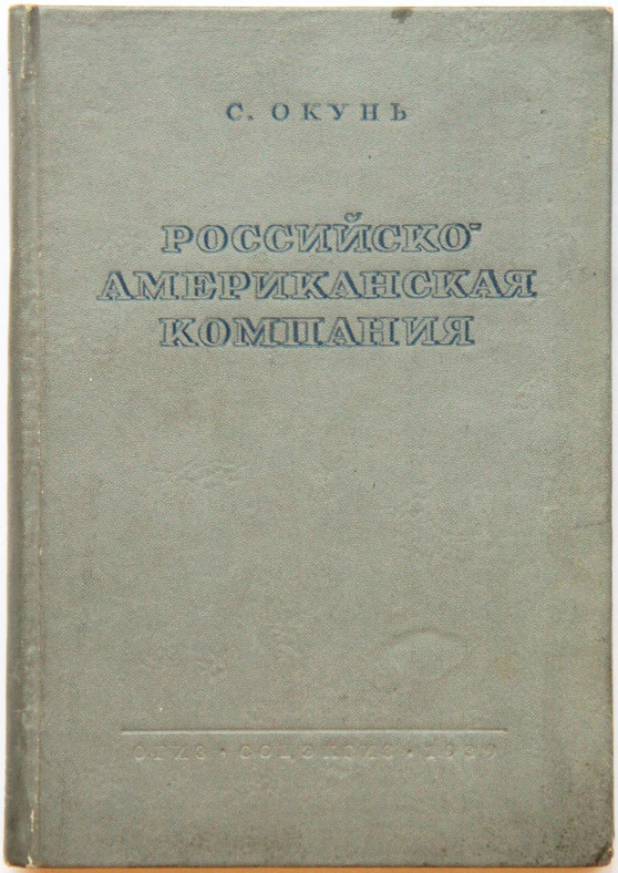 Окунь С.Б. Российско-американская компания. Под редакцией и с предисловием академика Б.Д.Грекова. М.-Л.: Государственное Социально-экономическое издательство, 1939. 258, [2] с., с илл. 20,2 х 14 см. Тираж 5000 экз. Издание докторской диссертации исследователя. Книга вышла под грифом: «Ленинградский Государственный Университет. Исторический факультет». В издательском переплете и в современном художественном футляре. Хорошая сохранность.