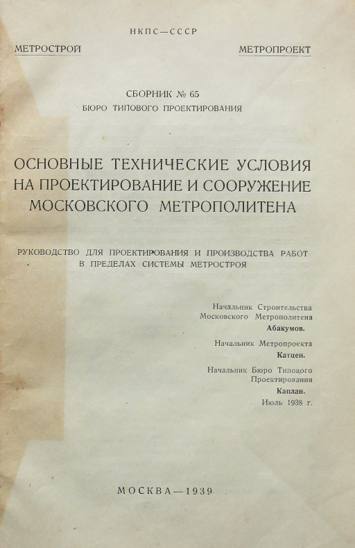 Основные технические условия на проектирование и сооружение Московского метрополитена: Руководство для проектирования и производства работ в пределах системы Метростроя. / Бюро типового проектирования, сборник № 65. М., 1939. 108 с. 22,5 х 15 см. В издательской обложке и в современном художественном футляре. Отличная сохранность.