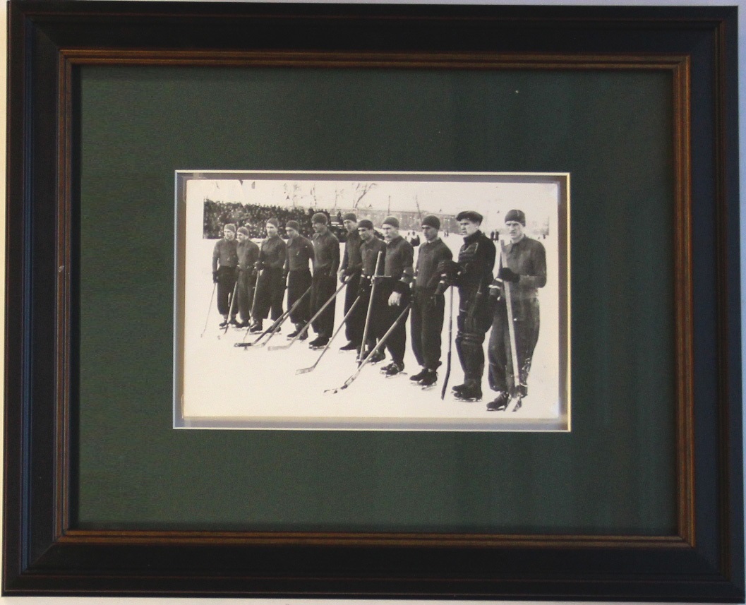 Первые чемпионы СССР 1947 г. по хоккею с шайбой. М., 1947. Фотография в раме. Размер снимка: 11,5 х 18 см. Размер в раме: 29,5 х 36 см. Очень хорошая сохранность.