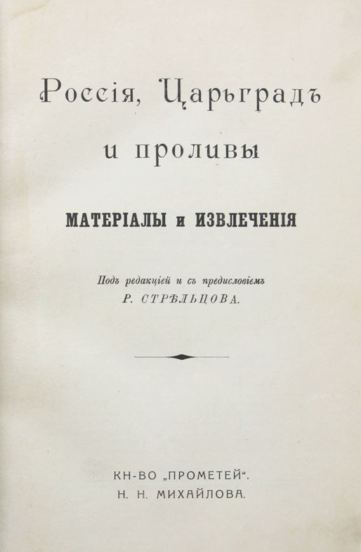 Россия, Царьград и проливы: Материалы и извлечения. Под редакцией и с предисловием Р.Стрельцова. [Пг.]: Прометей, [1915]. [2], IV, X, 134, [2] с. 23,5 х 16 см. В современном полукожаном переплете. Отличная сохранность.