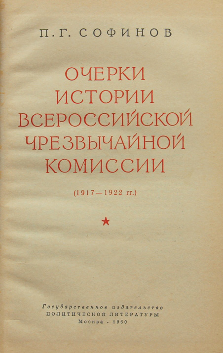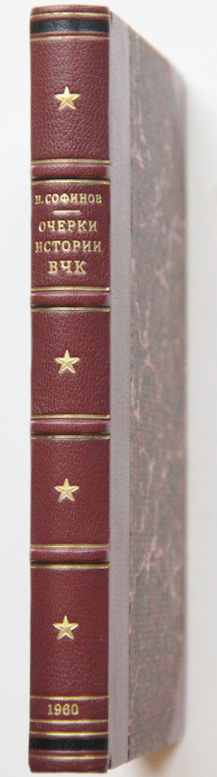 Софинов П.Г. Очерки истории Всероссийской чрезвычайной комиссии. (1917-1922 гг.). М.: Государственное издательство политической литературы, 1960. 248 с. 19,5 х 12,5 см. В современном полукожаном переплете с золотым тиснением на корешке. Отличная сохранность. Одно из первых обстоятельных исследований о работе ВЧК.