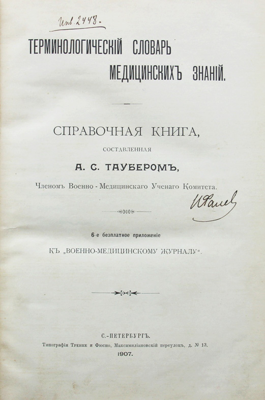 Таубер А.С. Терминологический словарь медицинских знаний: Справочная книга. Спб., типография Тренке и Фюсно, 1907. [4], 8 с., 1064 стлб., [4] с. 24,5 x 16,7 см. В современном полукожаном переплете. Отличная сохранность. На титульном листе владельческая подпись.