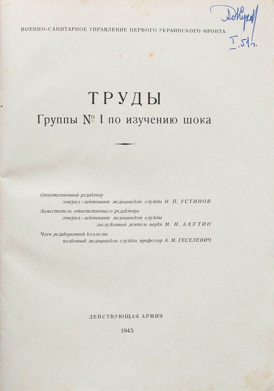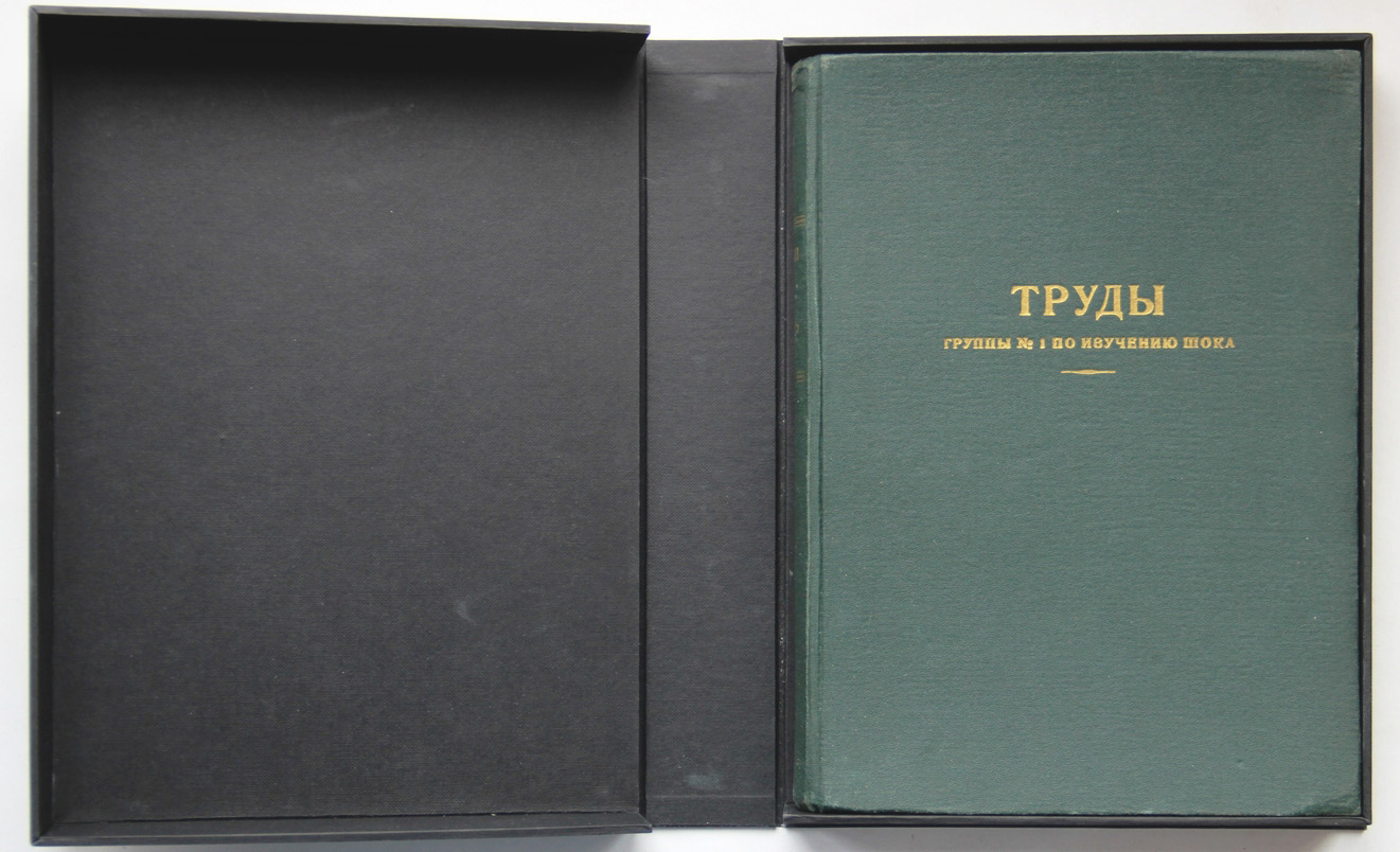 Труды Группы № 1 по изучению шока. Ответственный редактор генерал-лейтенант медицинской службы Н.П.Устинов. Заместитель ответственного редактора генерал-лейтенант медицинской службы заслуженный деятель науки М.Н.Ахутин. Член редакционной коллегии полковник медицинской службы профессор А.М.Геселевич. [Прага], Действующая армия, 1945. 426, [6] с., с илл. 25 х 18 см. Одна из лучших в мировой литературе книг о военно-травматическом шоке. Издана Военно-санитарным управлением Первого Украинского фронта в действующей армии. В издательском переплете и в современном художественном футляре. Очень хорошая сохранность. Редкость. На титульном листе владельческая подпись 1951 г.
