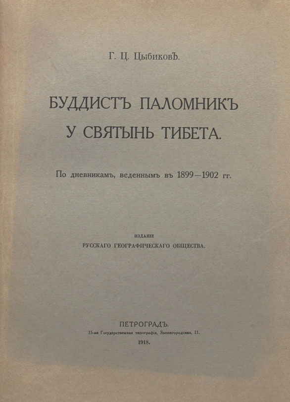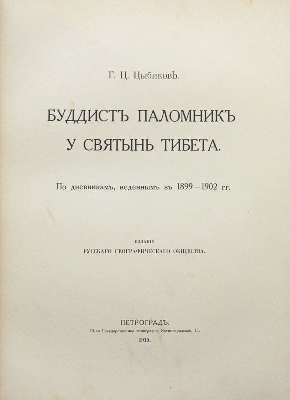 Цыбиков Г.Ц. Буддист паломник у святынь Тибета: По дневникам, веденным в 1899-1902 гг. Издание Русскаго Географическаго общества. Пг., 15-ая Государственная типография, 1919. X, 472 с., с илл. 28,5 x 21 см. В современном полукожаном переплете. Сохранена издательская обложка. Отличная сохранность.
