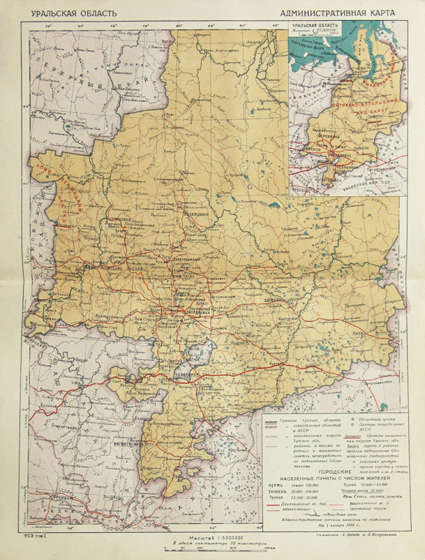 Уральская советская энциклопедия. Ответственный редактор Я.Р.Елькович. Том первый [единственный]: А, В, С - Вяхирь. Свердловск - М.: издательство Уралоблисполкома «Уральская советская энциклопедия, 1933. 854 стлб.; с илл. в тексте и 19 илл. на отдельных листах. 25,8 х 17,5 см. В издательском переплете. Отличная сохранность.