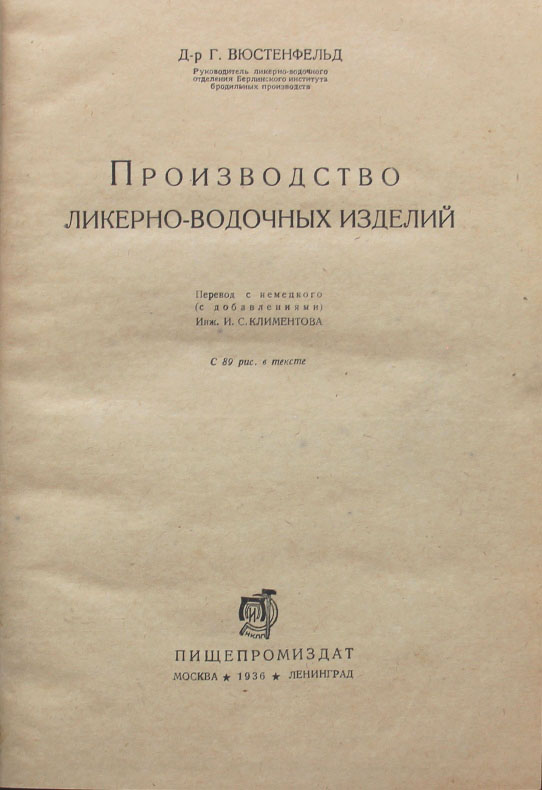 Вюстенфельд Г., д-р. Производство ликерно-водочных изделий. Перевод с немецкого (с добавлениями) инж. И.С.Климентова. С 89 рис. в тексте. М.-Л.: Пищепромиздат, 1936. 316, [4] с., с илл. 24,3 х 16,8 см. Тираж 3000 экз. Первое русское издание. В современном полукожаном переплете. Очень хорошая сохранность.