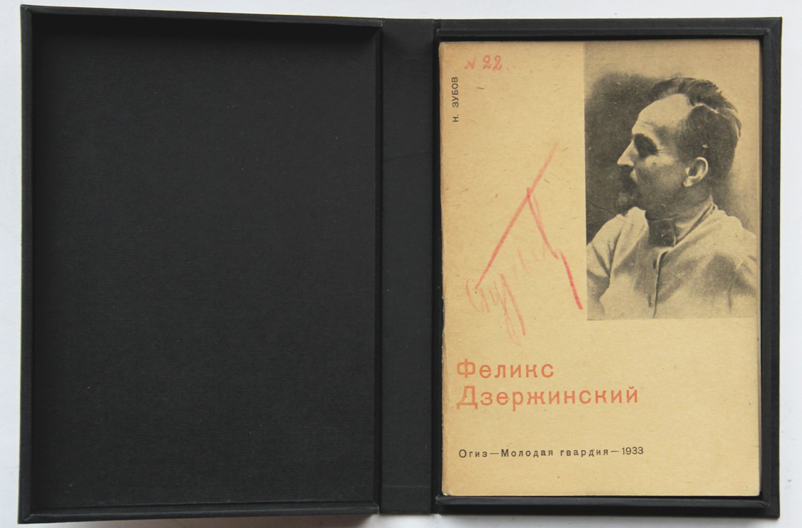 Зубов Н. Феликс Дзержинский: Краткое описание жизни и деятельности. [М.]: ОГИЗ - Молодая гвардия, 1933. 80 с. 17,7 х 12,3 см. Первое издание. В издательской обложке и в современном художественном футляре. Очень хорошая сохранность. На титульном листе дарственная надпись: «Сергею Степановичу Гурьеву, чьи воспоминания о Ф.Дзержинском могли бы обогатить этот слабый «опус». Автор Н.Зубов г. Ленинград 14.9.66 г.». Экземпляр из библиотеки С.С.Гурьева с его автографами на передней обложке и титульном листе, а также пометами в тексте.