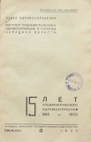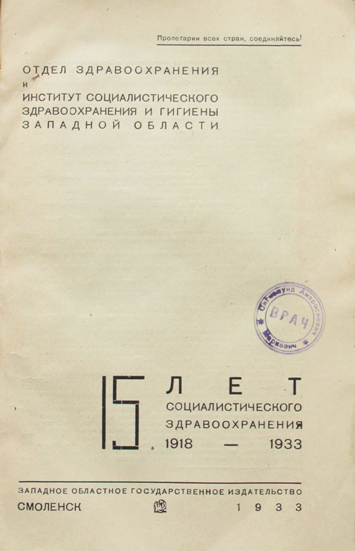 15 лет социалистического здравоохранения. 1918-1933. Смоленск: Западное областное Государственное издательство, 1933. 212 с., с илл. 24,7 х 16,5 см. Тираж 1282 экз. В издательской обложке и в современном художественном футляре. На титульном листе владельческий штамп: «Врач Сигизмунд Амвросиевич Маркевич». На передней обложке штамп: «Областной Дом санитарной культуры. г. Смоленск, Б.Пролетарская, 7. Просьба подтвердить получение». Хорошая сохранность. Редкость.