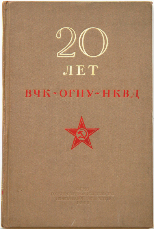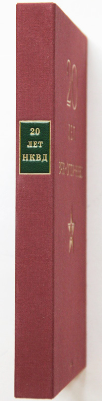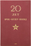 20 лет ВЧК-ОГПУ-НКВД. [М.]: ОГИЗ - Государственное издательство политической литературы, 1938. 64 с.; 5 л. илл. 22,5 х 14,8 см. Юбилейное издание, посвященное 20-й годовщине ВЧК-ОГПУ-НКВД. Художественный редактор С.Телингатер. Экземпляр из особой части тиража, предназначавшейся для высших чинов НКВД и правительства. В издательском переплете и в современном цельнотканевом художественном футляре с золотым тиснением на передней крышке. Очень хорошая сохранность. Редкость. Нет 2 л. илл. с портретами Н.И.Ежова, аккуратные владельческие пометы в тексте простым карандашом.