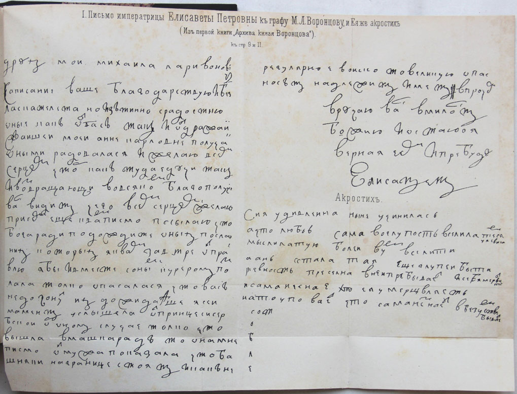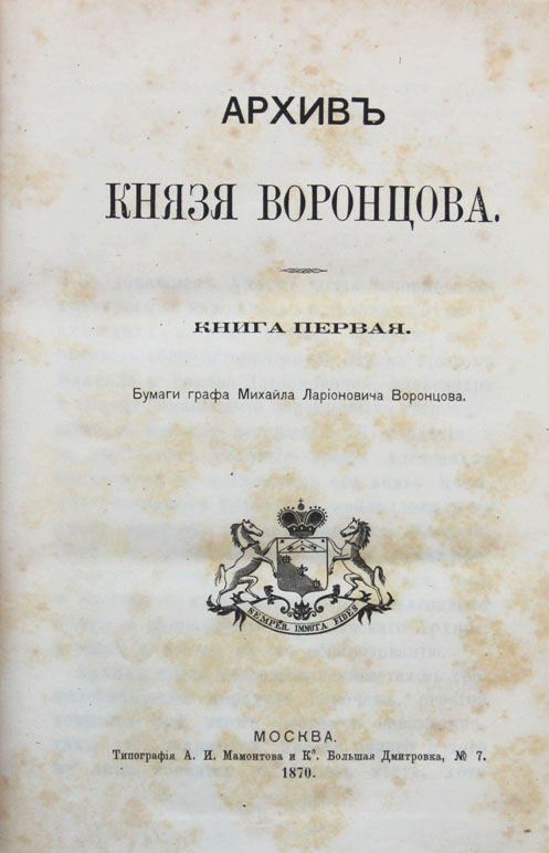 Графский род Воронцовых в течение XVIII-XIX вв. дал России плеяду выдающихся государственных деятелей: канцлер Российской империи Михаил Илларионович Воронцов (1714-1767); его племянник Александр Романович Воронцов (1741-1805), дипломат, сенатор, президент Коммерц-коллегии, с 1801 г. - государственный канцлер; младший брат Александра Романовича - Семен Романович Воронцов (1744-1832), который был русским послом в Англии с 1785 по 1806 г.; наконец, сын С.Р.Воронцова - Михаил Семенович (1782-1856), новороссийский генерал-губернатор и наместник Бессарабии, с 1844 г. кавказский наместник. «Архив князя Воронцова» представляет собой многотомное издание документов, принадлежавших графам (а с 1845 г. князьям) Воронцовым, под редакцией П.И.Бартенева. Оно содержит огромный материал, касающийся важнейших сюжетов русской и европейской истории. В переписке и других документах архива освещены военные, внешне- и внутриполитические, культурно-исторические события первостепенного значения, раскрывается их суть и тайные пружины. Издатель архива - Петр Иванович Бартенев (1829-1912), выдающийся российский историк, библиограф и археограф. Он окончил историко-филологическое отделение Московского университета, затем работал в московском архиве, а с 1859 г. заведовал московской публичной библиотекой Черткова. Сфера его деятельности была чрезвычайно широка и разнообразна. В частности, он был издателем фундаментального «Русского архива» - издания, которое вышло в 598 томах и включило в себя огромный массив важнейших документов по русской истории. Публикация документов семейного архива графов и князей Воронцовых началась в 1870 г. по заказу Семена Михайловича Воронцова, сына и наследника М.С.Воронцова. Князь принимал в ней «личное, постоянное участие». Издание Архива продолжалось 25 лет и закончилось в 1895 г. П.И.Бартенев осуществлял разбор и описание документов семейного архива параллельно с их публикацией. У издателя не было четкого плана, он издавал документы, руководствуясь результатами своих поисков. Историк стремился соблюдать хронологический и тематический принципы в систематизации и публикации документов. Материалы издавались на языке оригинала (в основном - французском), без переводов. Сравнительно малая часть документов - на русском языке и небольшое количество на других европейских языках. «Архив князя Воронцова» без всяких преувеличений можно назвать бесценным и не потерявшим актуальности по сей день источником. Среди бумаг широко представлены письма и распоряжения царей, дипломатическая, секретная корреспонденция, перлюстрация писем известных политических деятелей. Вот лишь некоторые темы и массивы документов, получившие отражение и опубликованные в «Архиве». Управление хозяйством Елизаветы Петровны; 34 письма дипломата и литератора князя Антиоха Дмитриевича Кантемира за 1742-1744 гг.; 26 писем принцессы Цербстской Иоанны Елизаветы (матери императрицы Екатерины II) к графу М.Л.Воронцову с приложениями за 1744-1759 гг. (кн. 1). Переписка по делу Б.К.Миниха и Э.И.Бирона (кн. 2). Бумаги, касающиеся покушения на жизнь императрицы Елизаветы Петровны (книга 3). Документы, освещающие конференцию графа М.Л.Воронцова с иностранными послами в царствование Петра III, 1762 г.; черновые записки о конференции графа М.Л.Воронцова с иностранными министрами с 6 июля 1762 г. по 9 января 1763 г.; переписка графа М.Л.В