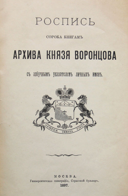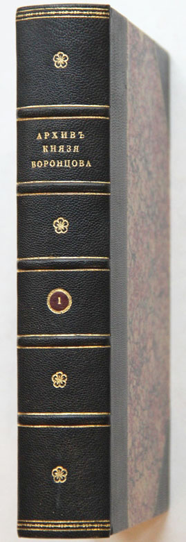 Архив князя Воронцова. 40 томов. М., типография А.И.Мамонтова и К,1870-1895. Роспись сорока книгам архива князя Воронцова с азбучным указателем личных имен. М., Университетская типография, 1897. [6], 240 с. 21,5 х 14,3 см. В 41 современном полукожаном переплете. Тираж: 425 экземпляров. Отличная сохранность. Издание имеет историческое значение, представляет интерес для музеев. Полный комплект с Росписью – большая редкость, имеется преимущественно только в крупнейших фундаментальных библиотеках страны.