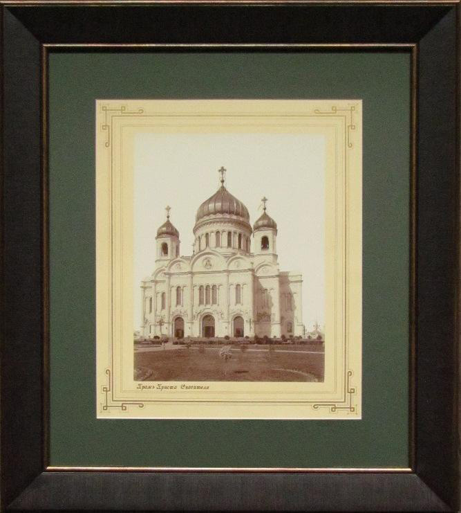 Храм Христа Спасителя. [Спб., Фотография А.Рейнбот и Ко, 1890-е г.г.]. Фотография в раме, наклеена на фирменное паспарту, украшенное золотой орнаментальной рамкой. Размеры снимка: 27,6 х 21,4 см. Размеры в раме: 57,2 x 51,2 см. Отличная сохранность.