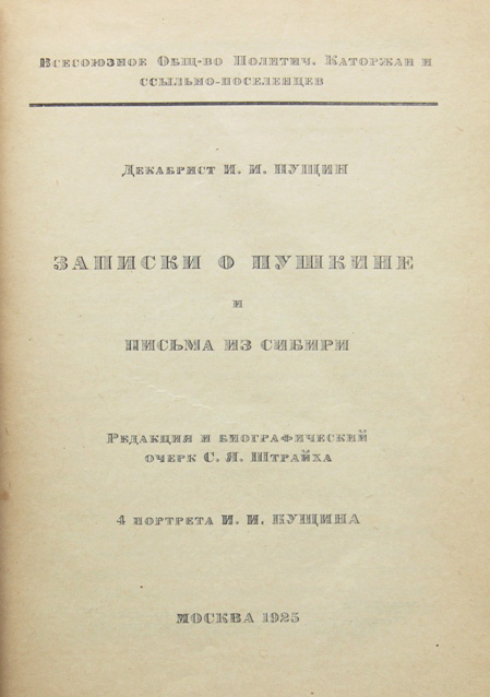 Пущин И.И. Записки о Пушкине и письма из Сибири. Редакция и биографический очерк С.Я.Штрайха. 4 портрета И.И.Пущина. М.: Всесоюзное Общ-во Политич. Каторжан и ссыльно-поселенцев, 1925. 368 с.; 4 портрета. 17 х 12,1 см. Юбилейное издание к 100-летию восстания декабристов. В современном полукожаном переплете с золотым тиснением на корешке. Отличная сохранность.