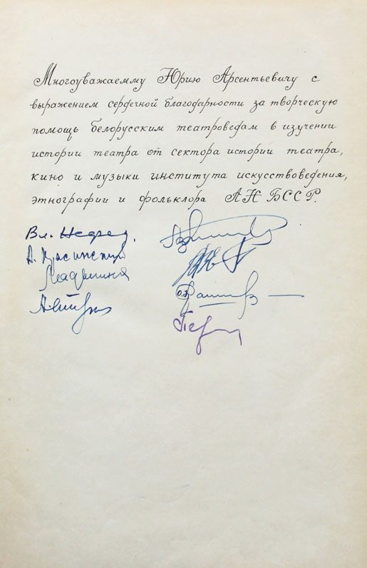 Белорусское искусство: Сборник статей и материалов. [Вып. II]. Минск: издательство Академии наук Белорусской ССР, 1960. 218, [2] с., с илл. 26 х 17 см. Тираж 2000 экз. На белорусском языке. В издательском переплете и в современном художественном футляре. Очень хорошая сохранность. Ошибка типографии: с. 193-208 вставлены дважды. На переднем форзаце дарственная надпись: «Многоуважаемому Юрию Арсентьевичу с выражением сердечной благодарности за творческую помощь белорусским театроведам в изучении истории театра от сектора истории театра, кино и музыки института искусствоведения, этнографии и фольклора АН БССР. [Подписи]».