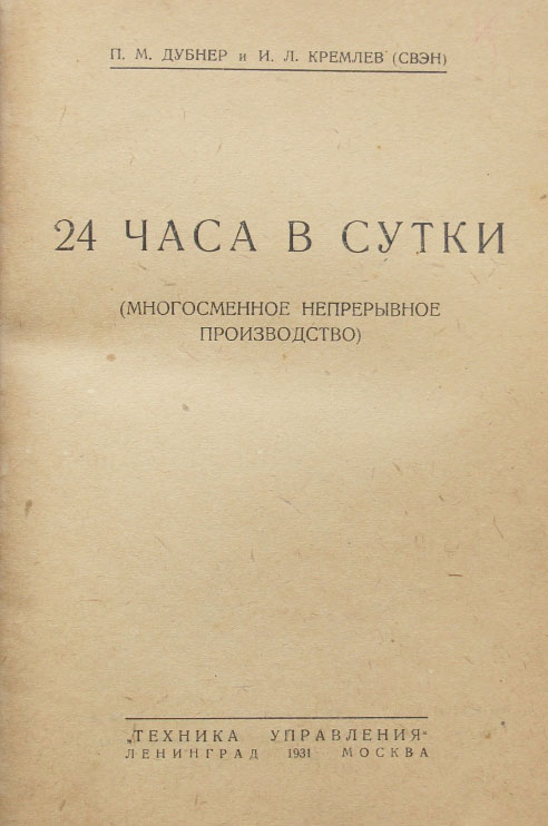 Дубнер П.М., Кремлев И.Л. (Свэн). 24 часа в сутки. (Многосменное непрерывное производство). Л.-М.: Техника управления, 1931. 230, [2] с. 20,5 х 13,7 см. В современном полукожаном переплете. Сохранена иллюстрированная издательская обложка. Очень хорошая сохранность.
