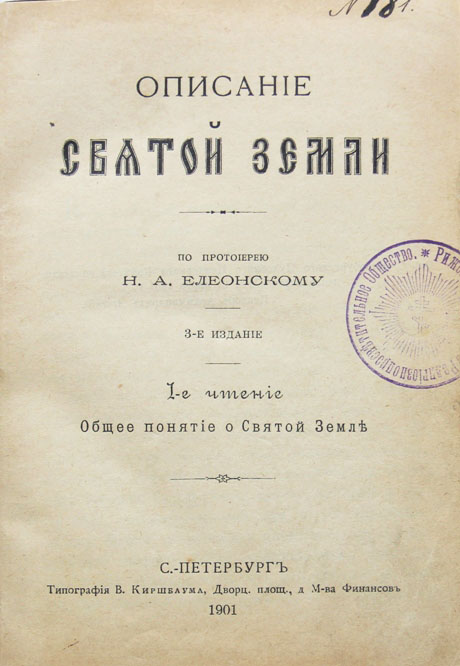 Елеонский Н.А., прот. Описание Святой Земли. 1-8 чтения. 3-е издание. [Издание Императорского православного Палестинского общества]. Спб., типография В.Киршбаума, 1901. 17,5 х 12,5 см. Полный комплект из 8 выпусков. В современном полукожаном переплете. Очень хорошая сохранность. На титульных листах всех выпусков дореволюционная печать: «Рижское Православное Религиозно-просветительное Общество».