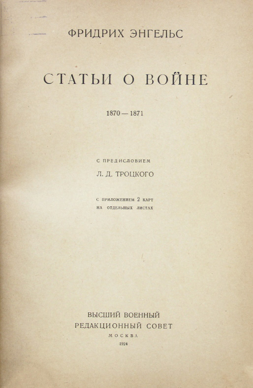 Энгельс Ф. Статьи о войне: 1870-1871. С предисловием Л.Д.Троцкого. С приложением 2 карт на отдельных листах. М.: Высший Военный Редакционный Совет, 1924. XIX, 256, [2] с.; 2 л. карт. 22 х 14,5 см. Первое русское издание. Тираж 7000 экз. В современном полукожаном переплете. Сохранена издательская обложка. Отличная сохранность.