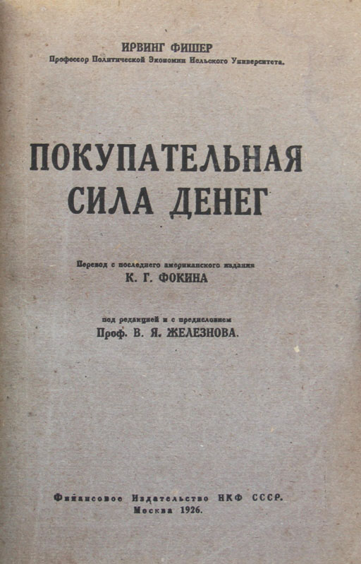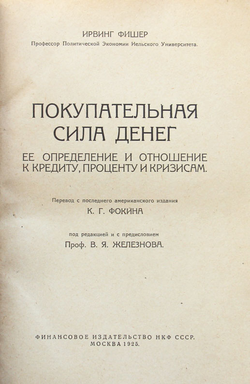 Фишер И. Покупательная сила денег: Ее определение и отношение к кредиту, проценту и кризисам. Перевод с последнего американского издания К.Г.Фокина. Под редакцией и с предисловием проф. В.Я.Железнова. М.: Финансовое издательство НКФ СССР, 1925. XXIV, 400 с., с илл.; 2 л. табл. 22,8 х 15 см. Тираж 3000 экз. В современном полукожаном переплете. Сохранена издательская обложка. Очень хорошая сохранность.