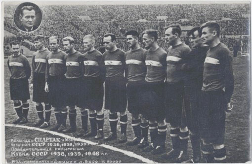На снимке представлена футбольная команда московского «Спартака». Внизу снимка подпись: «Команда «Динамо» Москва. Чемпион СССР 1936, 1938, 1939 г.г. Победительница розыгрыша Кубка СССР 1938, 1939, 1946 г.г.». Фотография была издана спорткомбинатом «Динамо» в рекламных целях тиражом 90000 экз. В верхнем правом углу врезка с портретом главного тренера команды А.Х.Вольрата.