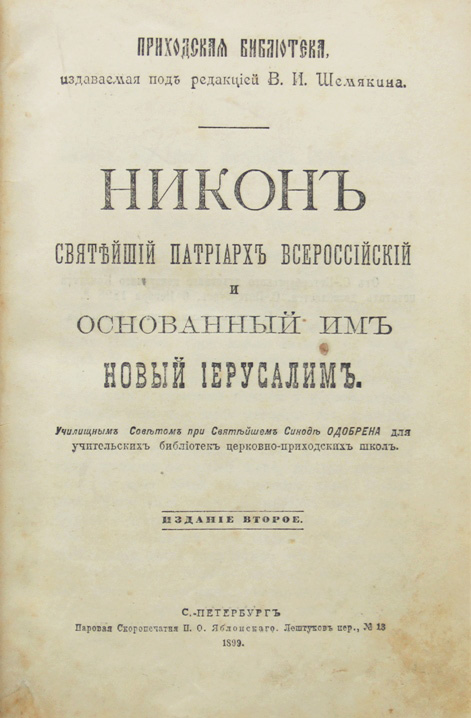 [Георгиевский Г.П.]. Никон Святейший партиарх Всероссйский и основанный им Новый Иерусалим. Издание второе. Спб., Паровая Скоропечатня П.О.Яблонскаго, 1899. 346 с.; 1 л. портр. 18,5 х 12,3 см. В современном полукожаном переплете. Очень хорошая сохранность. На обороте фронтисписа дореволюционный штамп: «Библиотека Шелыгинской второклассной церковно-приходской школы Вологодскаго уезда».