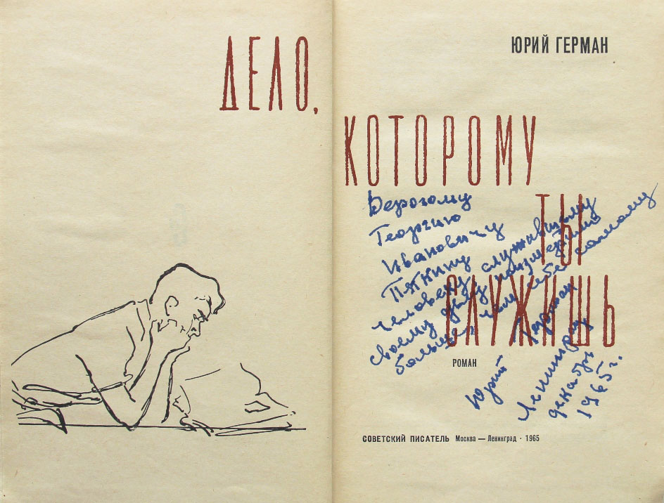 Герман Ю. Дело, которому ты служишь: Роман. М.-Л.: Советский писатель, 1965. 406, [2] с., с илл. 19,7 х 13 см. В иллюстрированном издательском переплете и в современном художественном футляре. Хорошая сохранность. На титульном листе автограф автора: «Дорогому Георгию Ивановичу Пяткину, человеку, служившему своему делу неизмеримо больше, чем себе самому. Юрий Герман. Ленинград декабрь 1965 г.».