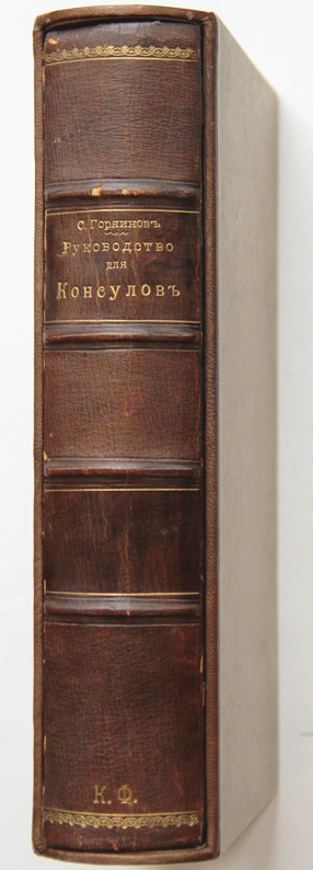 Горяинов С.М. Руководство для консулов. Спб., типография И.Н.Скороходова, 1903. XVI, 792 c. 24 х 15,7 см. В полукожаном переплете эпохи и в современном картонажном футляре. Очень хорошая сохранность. Редкое издание, посвященное консульскому праву. Книга впоследствии не переиздавалась.