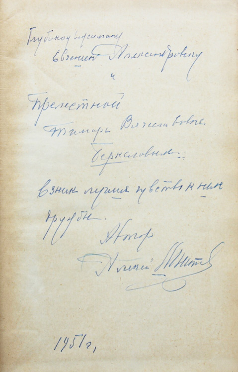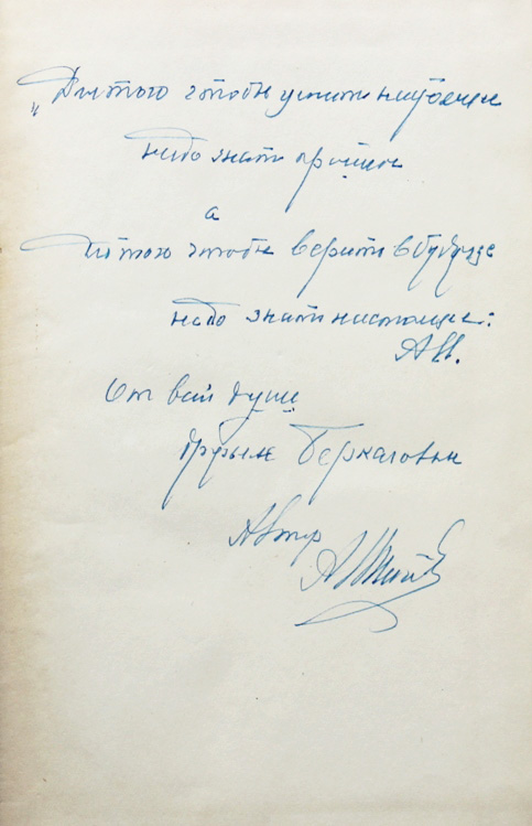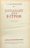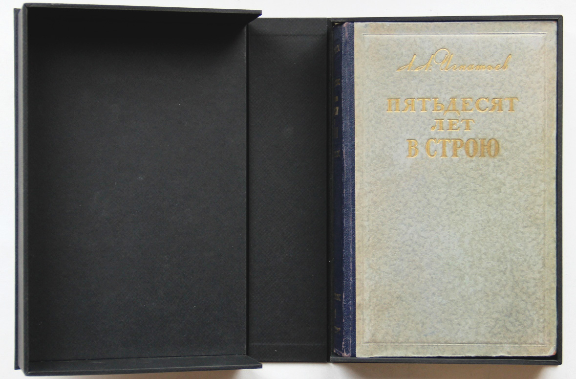 Игнатьев А.А. Пятьдесят лет в строю. 2 тома. М.: Государственное издательство художественной литературы, 1950. 19,8 х 13 см. В издательских переплетах и в современных художественных футлярах. Хорошая сохранность. На передних форзацах обоих томов автографы автора: «Глубокоуважаемому Евгению Александровичу и прелестной Тамаре Вячеславовне Беркаловым в знак лучших чувств к ним дружбы. Автор Алексей Игнатьев. 1951 г.», «"Для того чтобы ценить настоящее, нужно знать прошлое, а для того, чтобы верить в будущее, нужно знать настоящее!". А.И. От всей души друзьям Беркаловым. Автор А.Игнатьев».