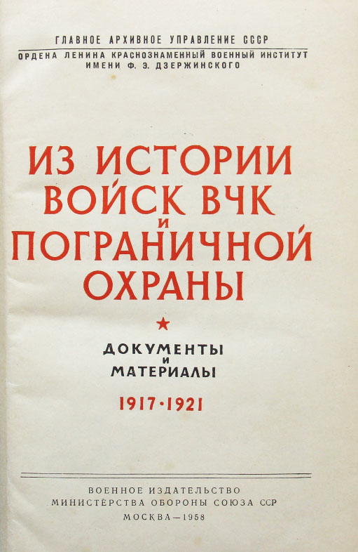 Из истории войск ВЧК и пограничной охраны: Документы и материалы. 1917-1921. М.: Военное издательство, 1958. 522, [2] с. 21,3 х 14 см. В современном полукожаном переплете с золотым тиснением на корешке. Очень хорошая сохранность. Читательские пометы в тексте. Книга в продажу не поступала.