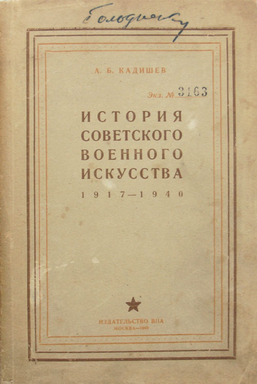 Кадишев А.Б. История советского военного искусства. 1917-1940. Второе дополненное издание. М.: [издательство Военно-политической академии им. В.И.Ленина], 1949. 370, [2] с., с илл.; 14 л. карт. 20 х 14 см. Экз. № 3463. Издание вышло ограниченным тиражом, не предназначалось для продажи, все экземпляры были пронумерованы и распространялись среди слушателей Военно-политической академии им. В.И.Ленина. В современном полукожаном переплете с золотым тиснением на корешке. Сохранена издательская обложка. Хорошая сохранность. На передней обложке и титульном листе владельческая подпись, аккуратные читательские пометы карандашом в тексте.