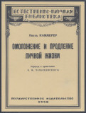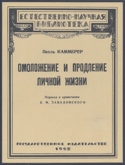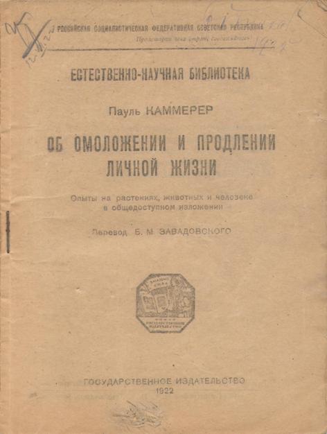 Каммерер П. Об омоложении и продлении личной жизни: Опыты на растениях, животных и человеке в общедоступном изложении. Перевод Б.М.Завадовского. [М.]: Государственное издательство, 1922. 86, [2] с., с илл. 17,2 х 13 см. В издательской обложке и в современном художественном футляре. Хорошая сохранность.