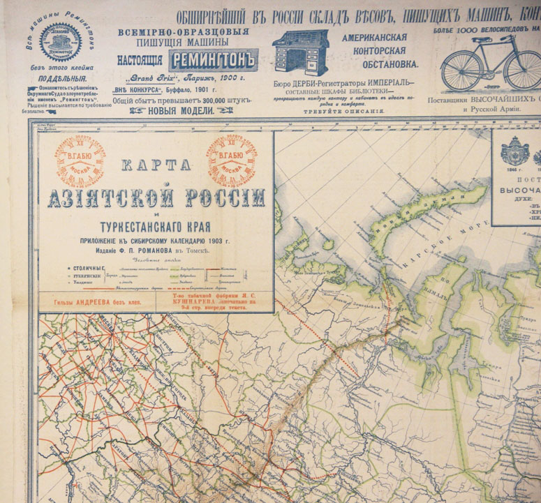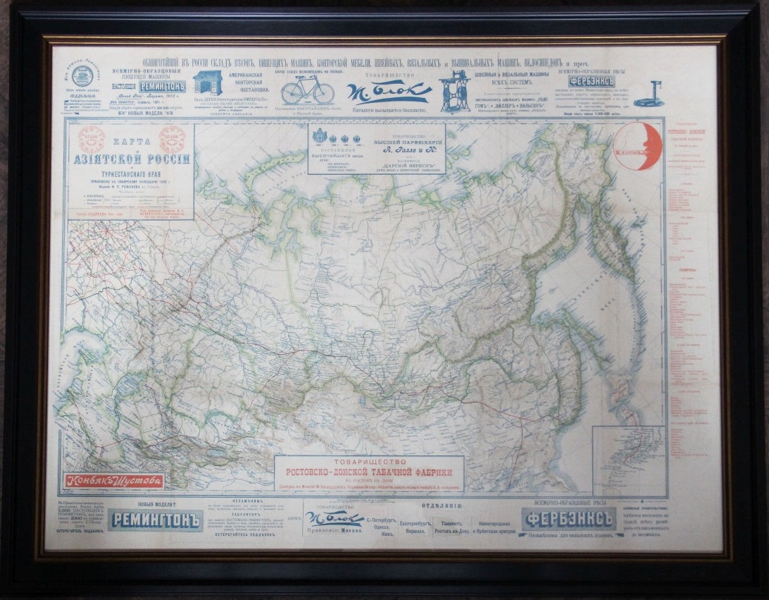 Карта Азиатской России и Туркестанскаго края. Приложение к Сибирскому календарю 1903 г. Издание Ф.П.Романова в Томске. Масштаб: в Английском дюйме 250 верст или 1:10500000. Спб., Картографическое заведение А.Ильина, [1902]. В раме. Размер карты: 46,5 х 73,5 см. Размер в раме: 72,5 х 92 см. Очень хорошая сохранность. На полях и оборотной стороне карты - многочисленная реклама торговых и промышленных предприятий России.