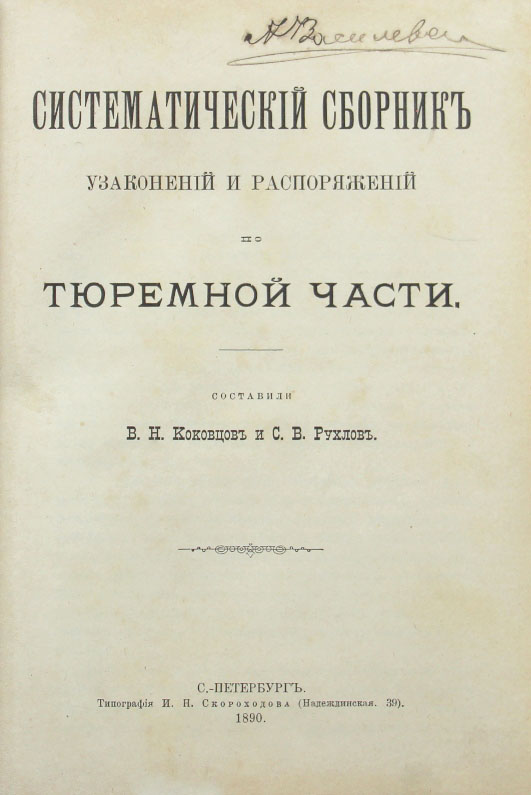 Коковцов В.Н., Рухлов С.В. Систематический сборник узаконений и распоряжений по тюремной части. Спб., типография И.Н.Скороходова, 1890. XIV, 562, 186 с.; с илл. 23 х 16 см. Первое издание. В современном полукожаном переплете. Очень хорошая сохранность. На титульном листе владельческая подпись.
