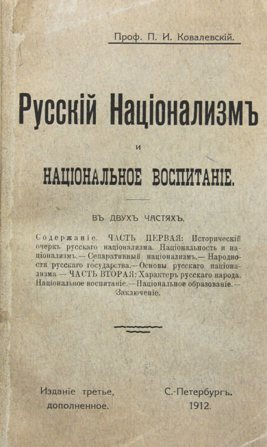 Три первых издания книги были напечатаны в С.-Петербурге в 1911-1912 г.г., в то время, когда П.И.Ковалевский являлся активным участником национально-монархического движения. Некоторое время он состоял членом старейшей петербургской элитарной монархической организации «Русское собрание», участвовал в деятельности возникшего на базе Собрания Русского окраинного общества, ставившего своей целью изучение национальных окраин Российской империи и борьбу с местным сепаратизмом. С образованием в 1908 г. Всероссийского национального союза П.И.Ковалевский стал одним из его ведущих идеологов. Он также принимал активное участие в деятельности Всероссийского национального клуба - культурно-просветительской и политической организации, созданной для пропаганды русского национализма.