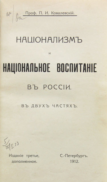 Ковалевский П.И., проф. Национализм и национальное воспитание в России. В двух частях. Издание третье, дополненное. Спб., [типография М.И.Акинфиева], 1912. 394 с. 17,3 х 10,5 см. В современном полукожаном переплете. Сохранена издательская обложка. Очень хорошая сохранность.