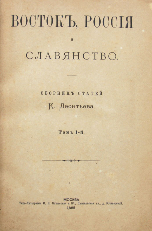 Леонтьев К. Восток, Россия и славянство: Сборник статей. 2 тома. М., Типо-Литография И.Н.Кушнерева и Ко. 1885-1886. 23,5 х 15,5 см. Первое издание. В современном полукожаном переплете. Отличная сохранность. Редкость.