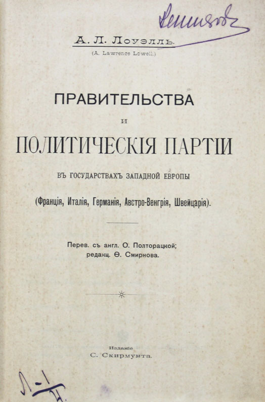 Лоуэлль А.Л. Правительства и политическия партии в государствах Западной Европы. (Франция, Италия, Германия, Австро-Венгрия, Швейцария). Перев. с англ. О.Полторацкой; редакц. Ф.Смирнова. [М.], издание С.Скирмунта, [1905]. VII, 644 с. 23 х 15,8 см. Сочинение впоследствии не переиздавалось. В современном полукожаном переплете. Отличная сохранность. На титульном листе владельческая подпись.
