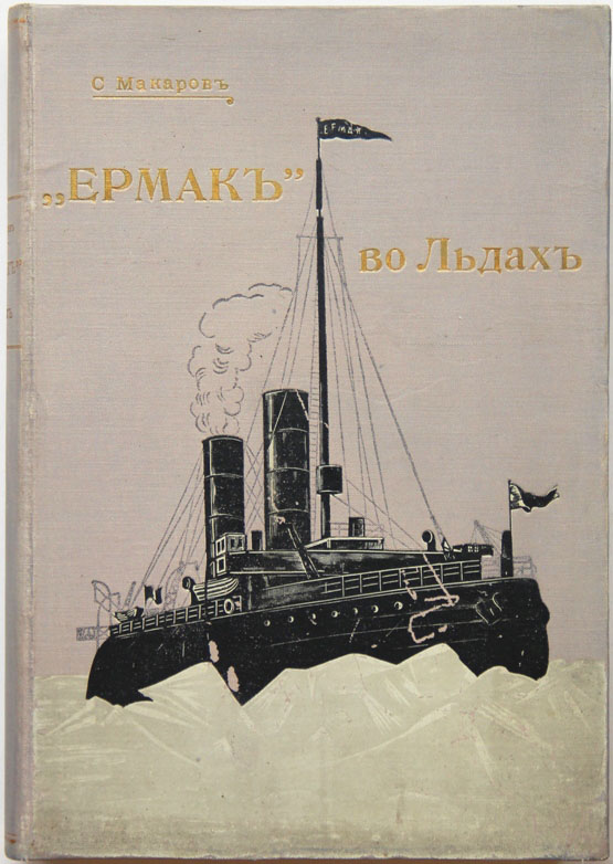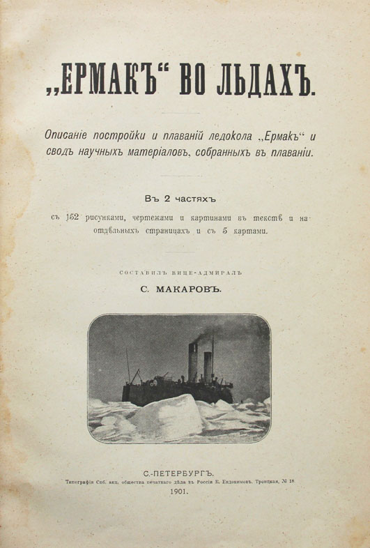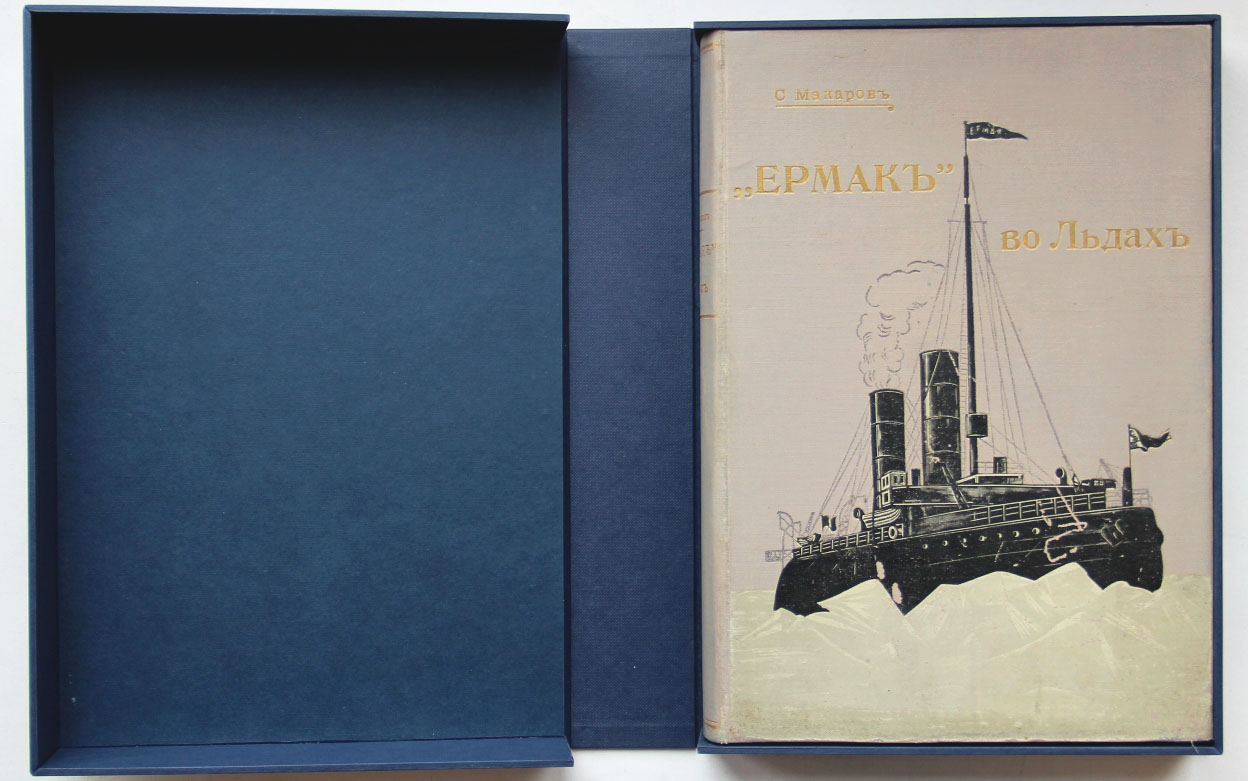 Макаров С.О. «Ермак» во льдах: Описание постройки и плаваний ледокола «Ермак» и свод научных материалов, собранных в плавании. В 2 частях. С 152 рисунками, чертежами и картинами в тексте и на отдельных страницах и с 5 картами. Спб., типография Спб. акц. общества печатнаго дела в России Е.Евдокимов, 1901. [4], XXII, [2], 507 с.; с илл. в тексте и 25 илл. на отдельных листах; 5 л. карт. 26,2 х 18 см. В иллюстрированном издательском переплете и в современном художественном футляре. Очень хорошая сохранность.