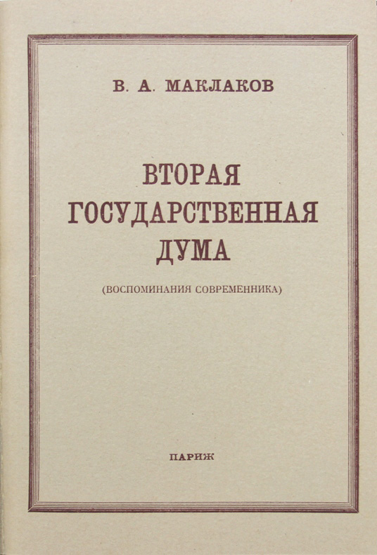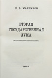 Маклаков В.А. Вторая Государственная Дума. (Воспоминания современника). Париж, [1936]. 258, [4] с. 22,6 x 15,7 см. В современном полукожаном переплете. Сохранена издательская обложка. Отличная сохранность.