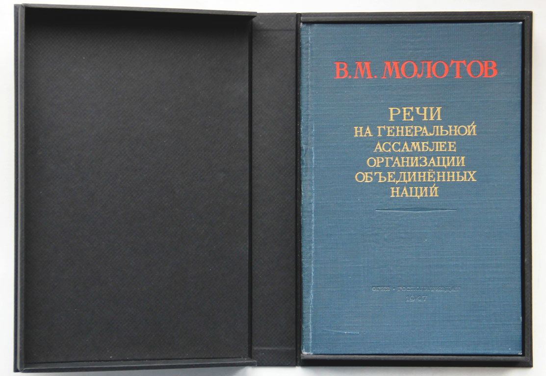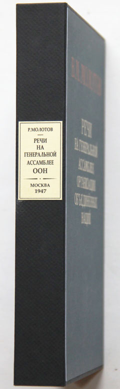 Молотов В.М. Речи на Генеральной ассамблее Организации объединенных наций: Вторая часть Первой сессии в Нью-Йорке. Октябрь-декабрь 1946 г. М.: ОГИЗ - Государственное издательство политической литературы, 1947. 146, [2] с.; 1 л. портр. 19,5 х 12,5 см. В издательском переплете и в современном художественном футляре. Отличная сохранность.