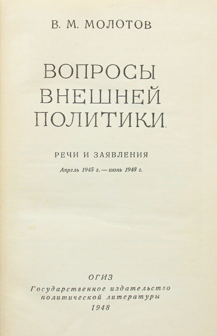 Молотов В.М. Вопросы внешней политики: Речи и заявления. Апрель 1945 г. - июнь 1948 г. [М.]: ОГИЗ - Государственное издательство политической литературы, 1948. 586, [2] с.; 1 л. портр. 19 х 12 см. В современном полукожаном переплете. Отличная сохранность.