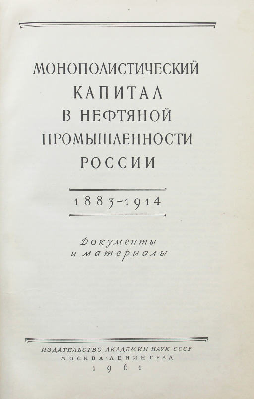 Монополистический капитал в нефтяной промышленности России: Документы и материалы. 2 тома. Л., 1961-1973. 25,5 х 16,5 см. В двух современных полукожаных переплетах. Отличная сохранность.