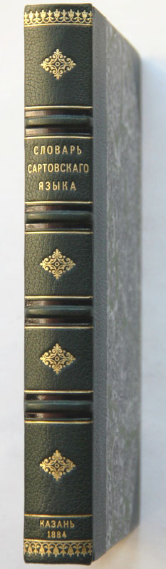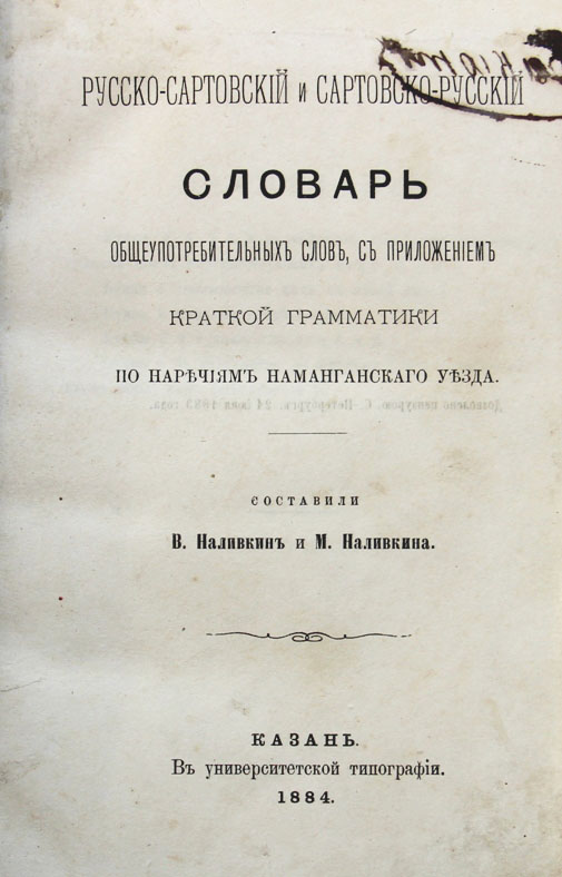 Наливкин В., Наливкина М. Русско-сартовский и сартовско-русский словарь общеупотребительных слов с приложением Краткой грамматики по наречиям Наманганскаго уезда. Казань, в Университетской типографии, 1884. 294, 161, 20, V с. 21 х 14 см. В современном полукожаном переплете с золотым тиснением на корешке. Хорошая сохранность. Владельческие пометы в тексте. Редкость.