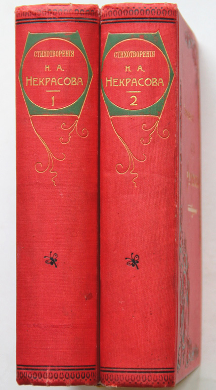 Некрасов Н.А. Полное собрание стихотворений. В двух томах. Восьмое издание. С портретом, факсимиле и биографическим очерком. Спб., типография А.С.Суворина, 1902. 21,3 х 14,3 см. В двух переплетах эпохи с золотым и цветным тиснением на корешках и передних крышках. Очень хорошая сохранность. На пустом листе перед авантитулом Т. I наклеена отрывная марка на подписку на настоящее издание.