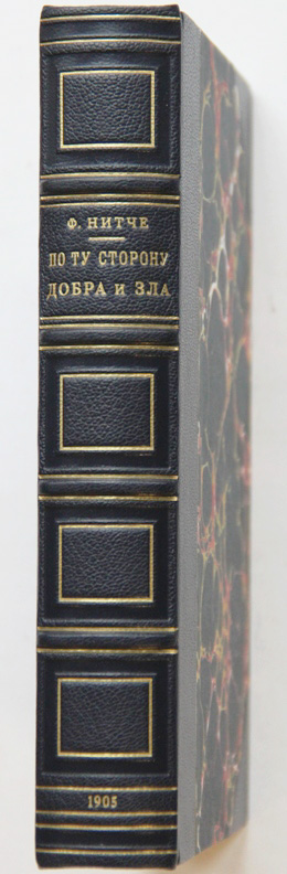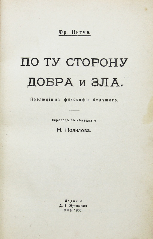 Нитче Фр. По ту сторону добра и зла: Прелюдии к философии будущаго. Перевод с немецкаго Н.Полилова. Спб., издание Д.Е.Жуковскаго, 1905. [4], 386, [2] с. 21,2 х 13,5 см. В современном полукожаном переплете. Отличная сохранность.